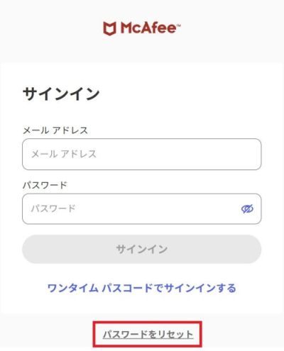 マカフィーマイアカウントのパスワードが不明な場合は、サインイン画面の「パスワードをリセット」をクリックし、パスワードリセットをお願いします。
