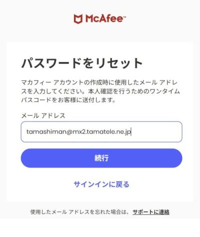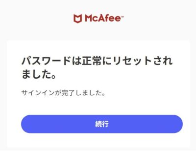 「パスワードは正常にリセットされました。」と表示されましたら、パスワードのリセットは完了です。「続行」をクリックし、マカフィーマイアカウントの本登録作業を進めます。