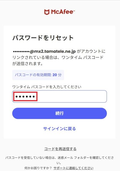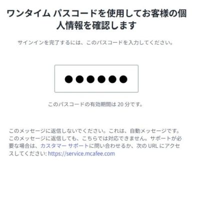「件名:マカフィー アカウントのワンタイム パスコード」のメールを受信後、本文内の「パスコード」を確認してください。