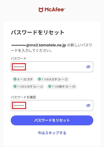 マカフィーマイアカウントページURLにアクセスして、「パスワードをリセット」をクリックします。